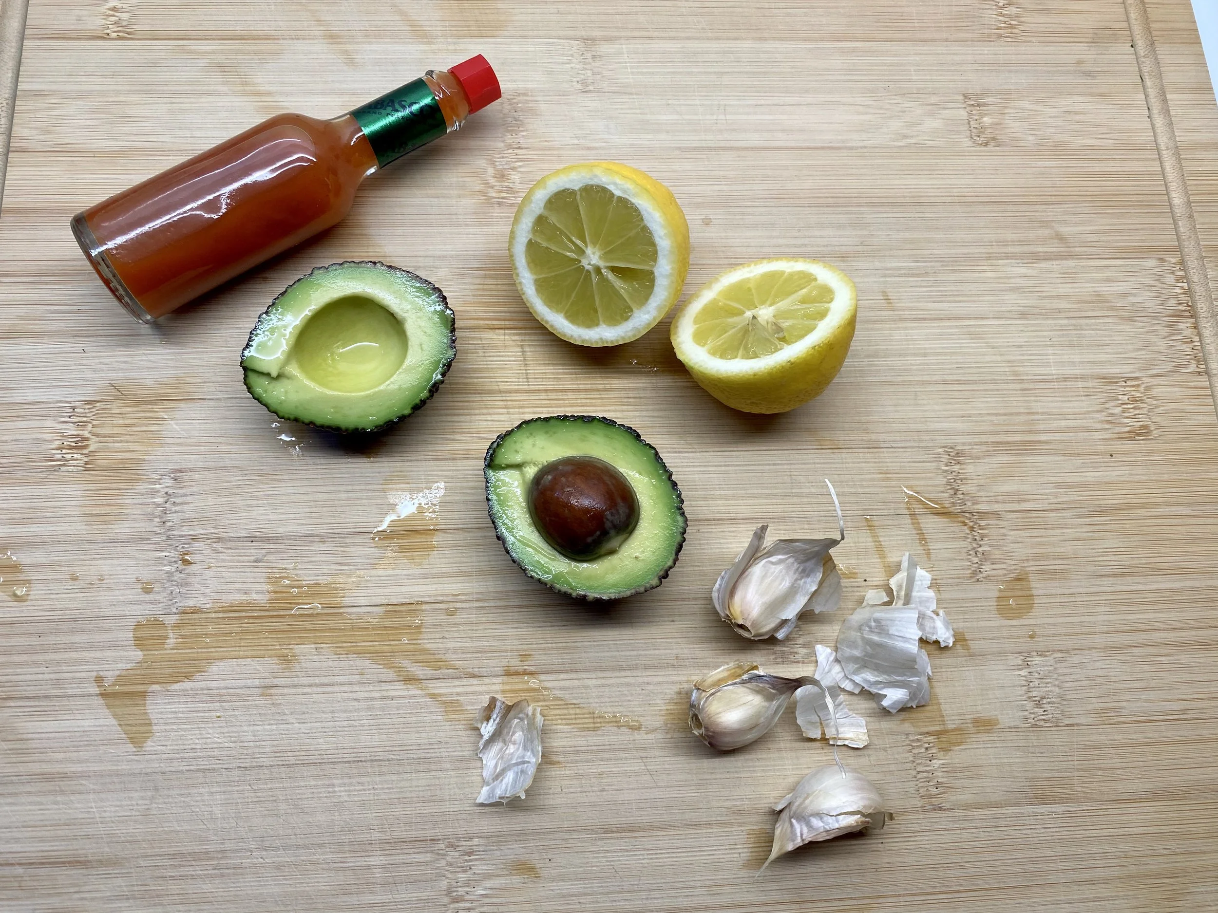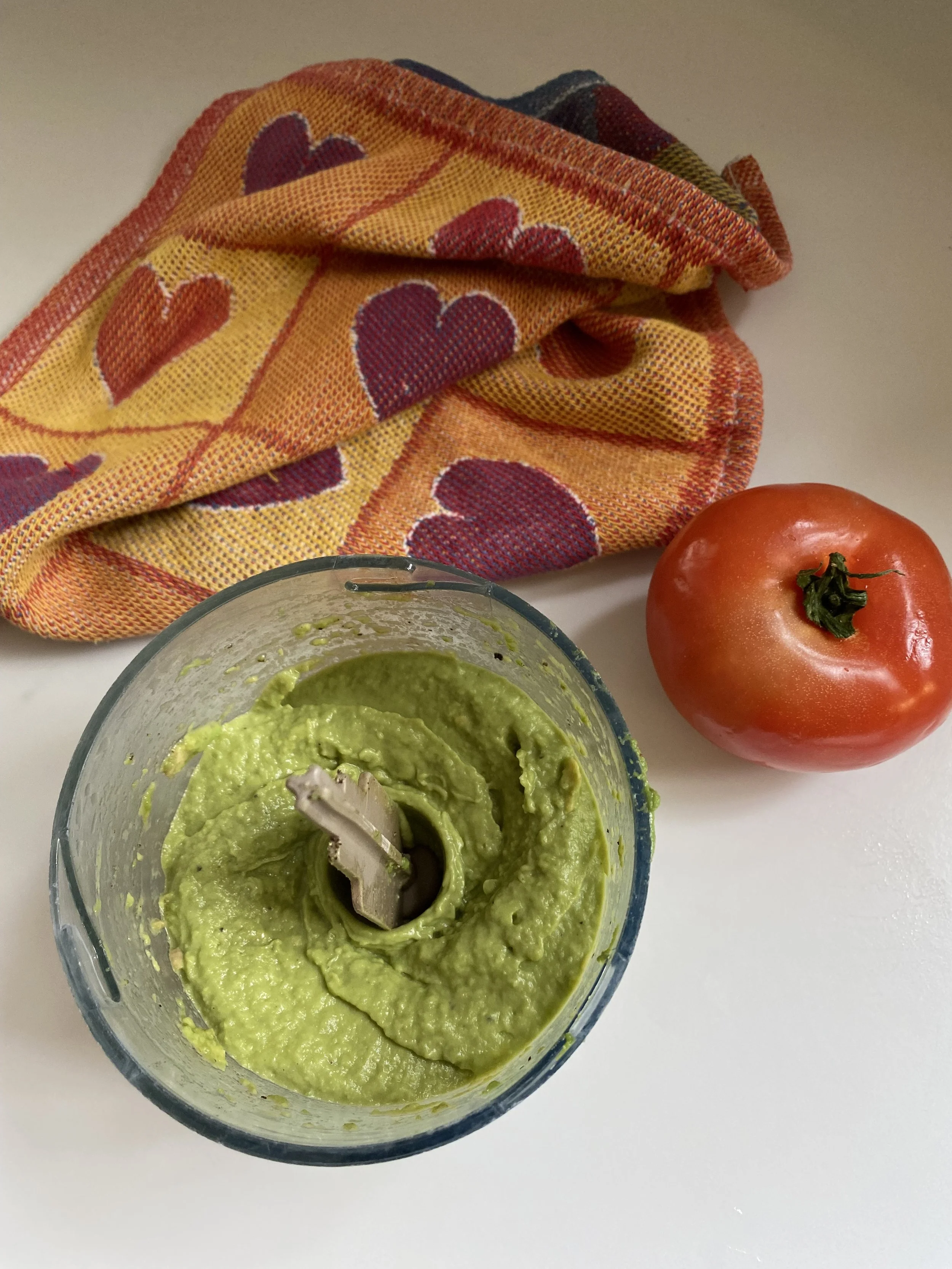 Χτυπάμε στο μπλέντερ το εσωτερικό από τα αβοκάντο, το σκόρδο, το λεμόνι και το ταμπάσκο μαζί με το αλατοπίπερο μέχρι να γίνουν μια λεία κρέμα. Προσθέτουμε τον μαϊδανό και, αν μας αρέσει, τη ντομάτα.